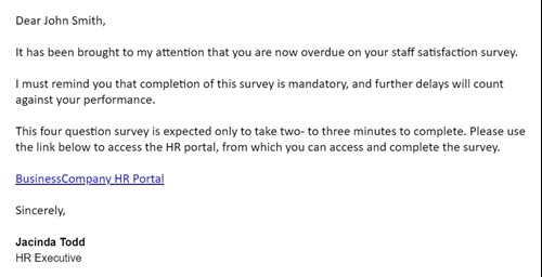 Figure 1: An example fake internal email which uses hyperlinked text to obfuscate a fraudulent external link. |