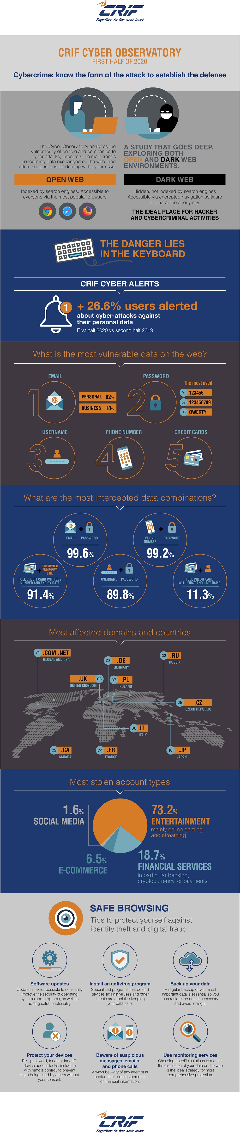 These are some of the key findings that emerged from the Cyber Observatory carried out by CRIF, which is aimed at analyzing the vulnerability of individuals and companies to cyber-attacks and interpreting the main trends concerning data exchanged in Open Web and Dark Web environments. The study also looks at the type of information, the environments in which data traffic is concentrated, and the most exposed countries, as well as offering some suggestions on how to deal with cyber risk.